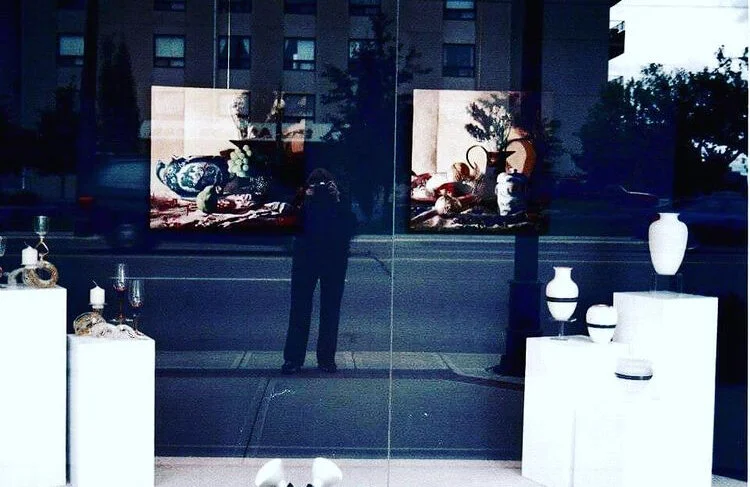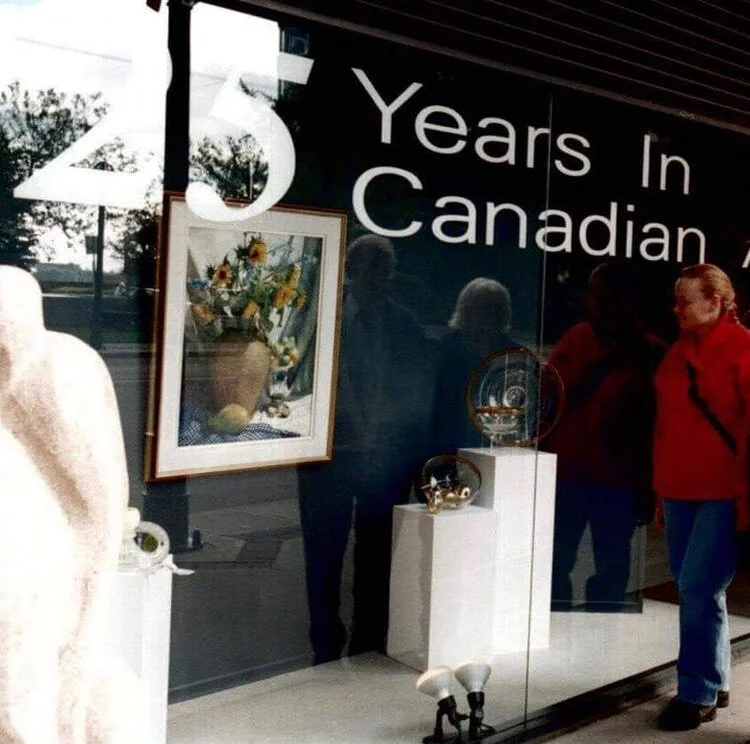 Agnes’ painting in the window of West End Gallery Edmonton AB Canada 2000